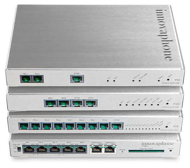 Basis der innovaphone IP Telefonie und Unified Communications Lösung sind die innovaphone VoIP Gateways. Sie sind in verschiedenen Ausführungen erhältlich und je nach Modell mit unterschiedlichen Lizenzen ausgestattet. Auf den innovaphone VoIP Gateways ist die PBX-Software bereits vorinstalliert und wird lediglich mit entsprechenden Lizenzen freigeschaltet. Unabhängig davon können die Geräte aber auch eine reine Gateway-Funktionalität übernehmen, dienen als Schnittstelle zu anderen Netzen und wandeln dabei vorhandene ISDN-, SIP- oder auch analoge Anschlüsse in IP-Verbindungen. Alle innovaphone VoIP Gateways sind sehr robust konstruiert – ihre Hardware kommt komplett ohne Festplatten oder Lüfter aus. Durch großzügig dimensionierte Komponenten und schlanke Software-Strukturen sind die VoIP Gateways äußerst leistungsstark, auch wenn sie parallel noch die Aufgabe der PBX erfüllen. Auch im Design der Gehäuse aus gebürstetem Edelstahl wird die Stabilität der VoIP Gateways widergespiegelt.